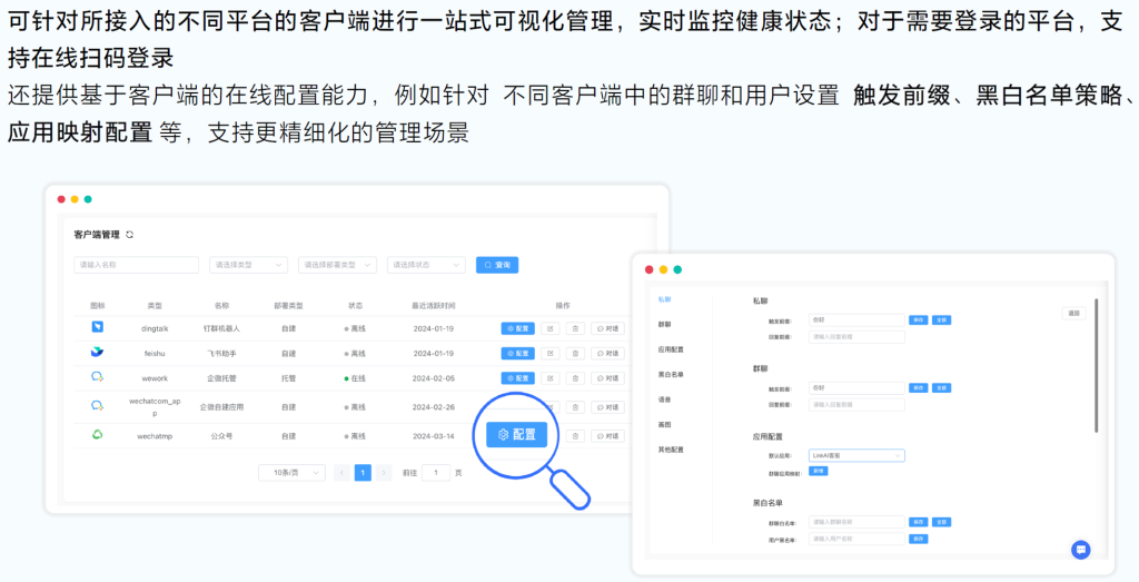 - 客户端管理:可以无需服务器部署,直接扫码或者填入相关配置参数即可托管接入,并提供统一的客户的管理功能: