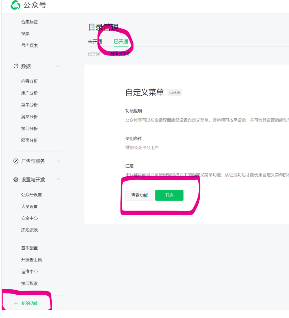 - 在最下方点击“+新的功能”,点击已开通,最后选择自定义菜单,点击开启,如下图所示。然后就发现自定义菜单有了!